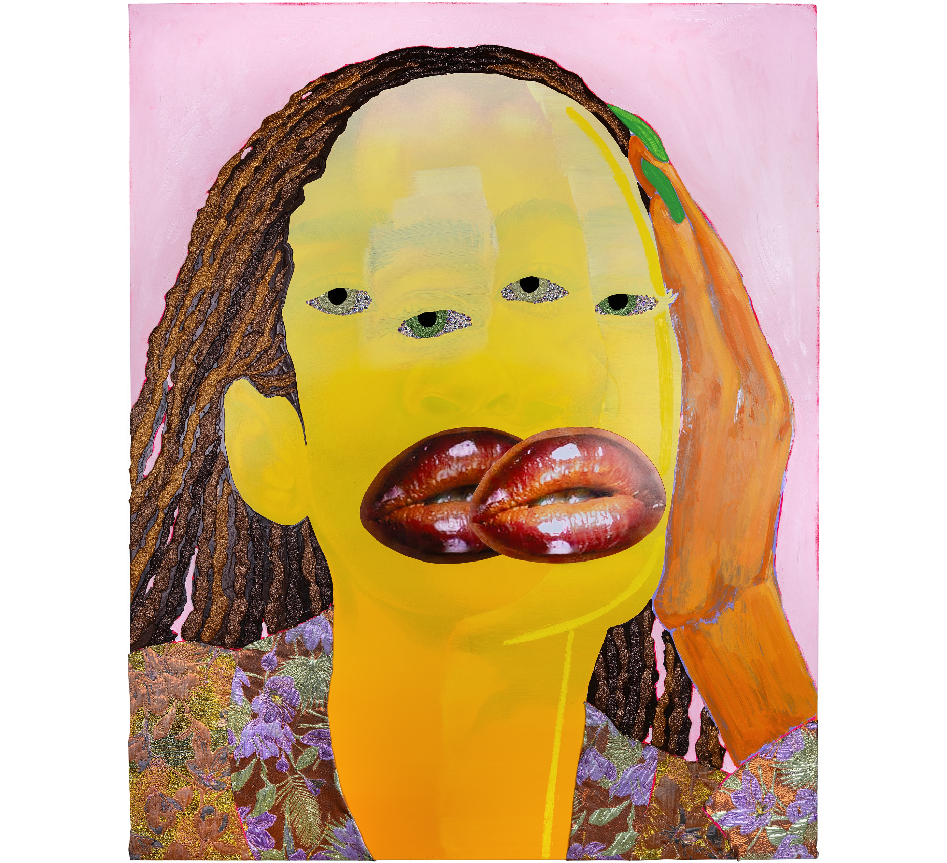 Devan Shimoyama, Jas, Doubled , 2023, Oil, color pencil, Flashe, rhinestones, acrylic, fabric, collage and glitter on canvas stretched over panel, 152.4 x 121.9 cm
